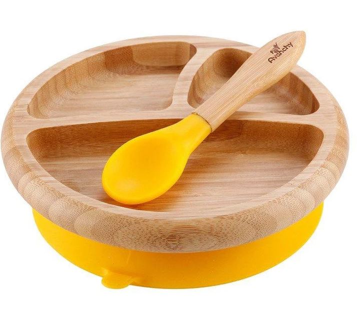 Another beautiful set is the Avanchy Baby Bamboo Stay Put Suction Plate + Spoon, Grey